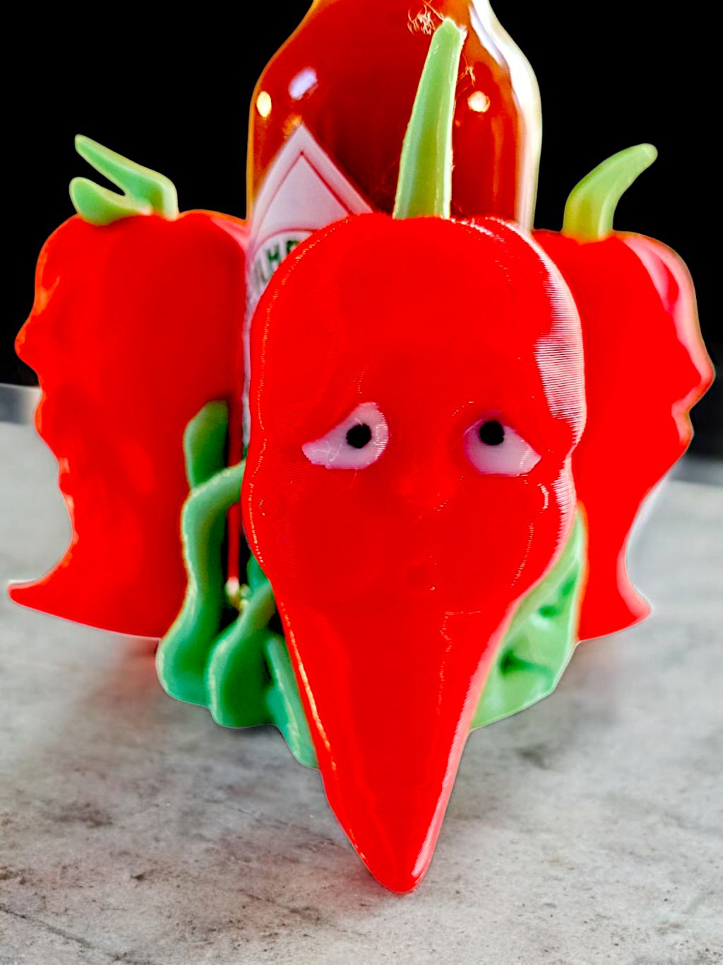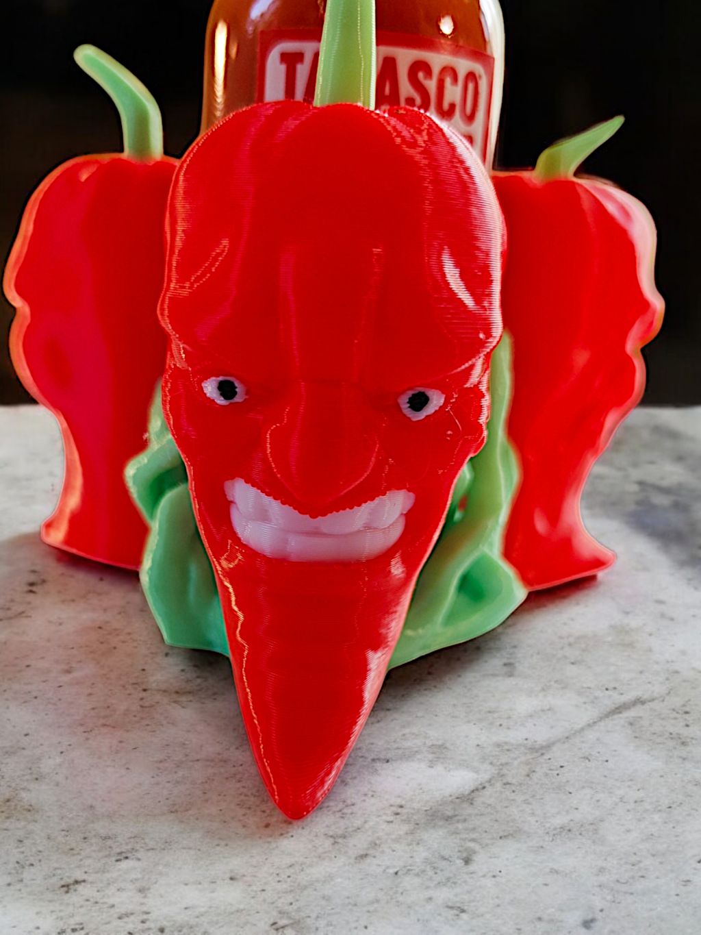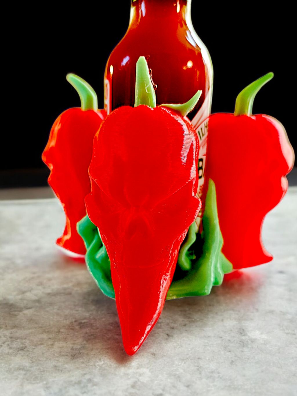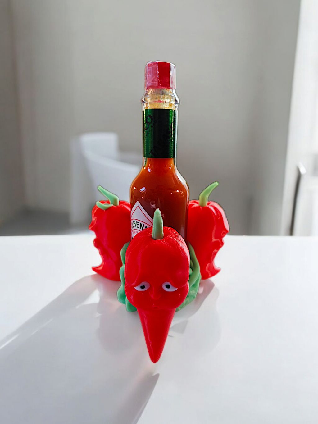 Unser Heat Range Tabasco-Ständer mit drei Chili-Figuren in verschiedenen Gesichtsausdrücken bringt Spaß, Übersicht und Ordnung auf deinen Tisch. Jede Chili steht für eine andere Schärfestufe – von entspannt über nervös bis feurig panisch – und hält dabei eine Flasche deiner Lieblingssauce sicher und stilvoll fest.