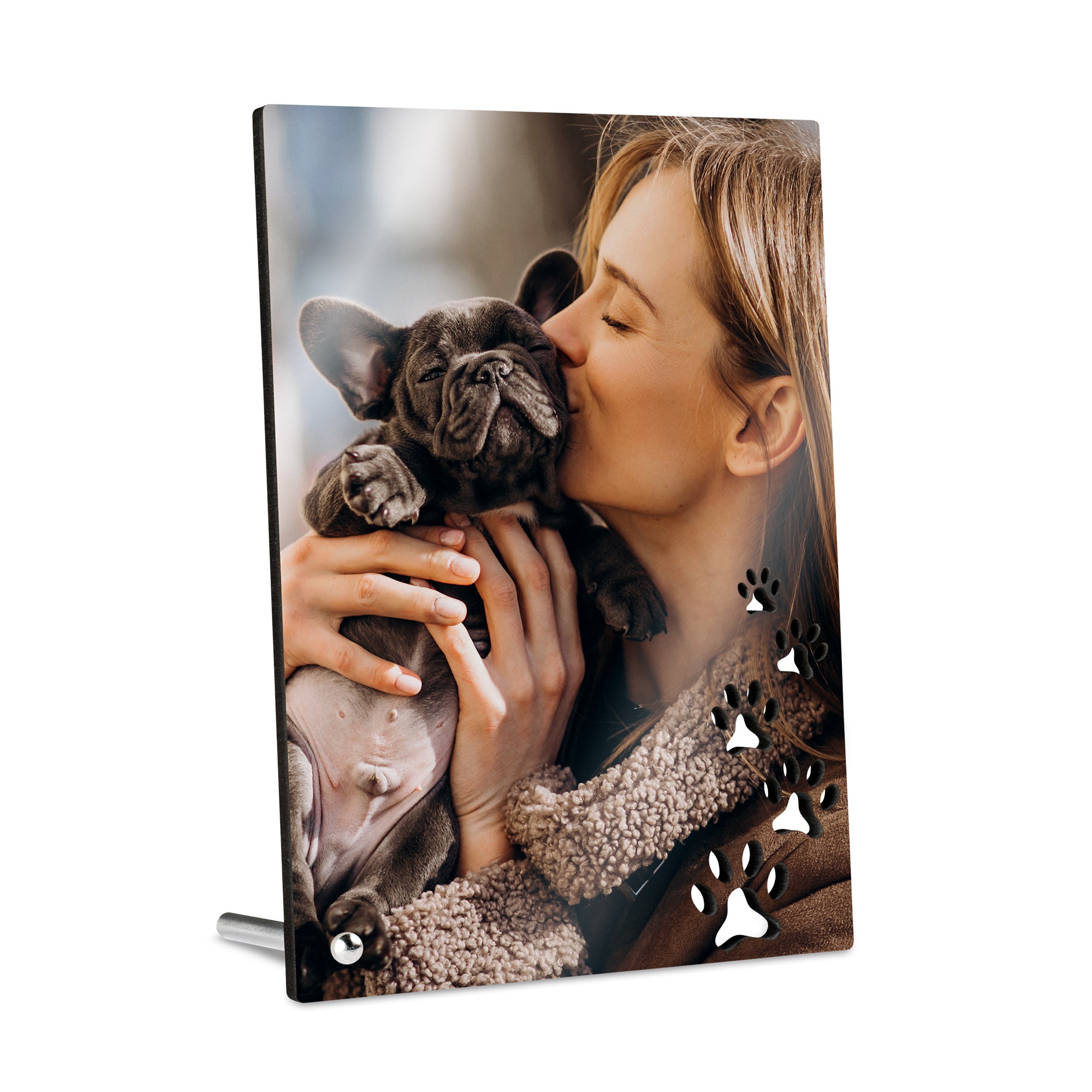 Die Silhouetten sind Kontur genau geschnitten in Formen von Pfotenabdrücken. Mit diesem emotionalen Bildaufsteller lässt sich jedem Hundeliebhaber eine große Freude machen.